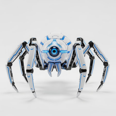 This image features an advanced robotic spider with a sleek design. The robot has a white body adorned with blue accents and a prominent blue eye in the center. It has eight articulated legs, each equipped with joints, allowing for intricate movements. The robotic spider appears to be designed for precision and agility, likely intended for tasks requiring complex navigation and manipulation.