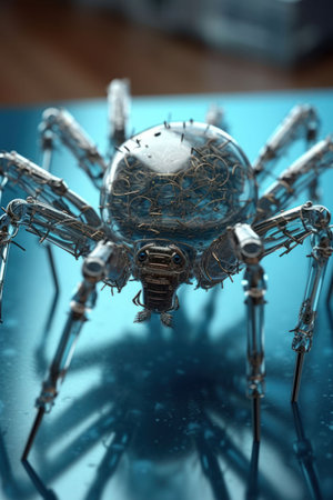 A large mechanical spider sitting on top of a glass table. Generative AI image.