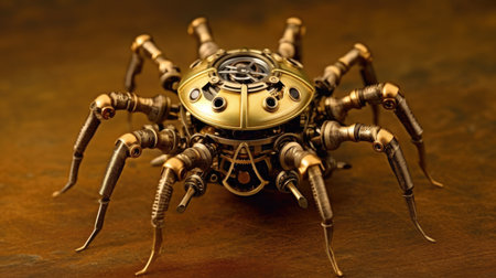 A marvel of steampunk engineering, this intricate mechanical spider stands ready.