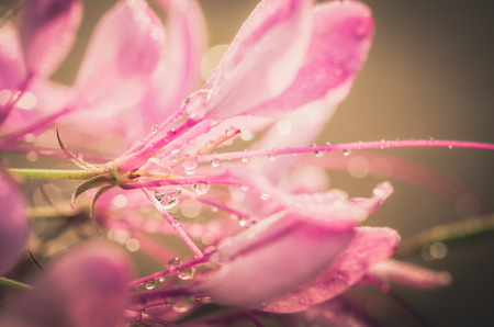 Closeup of tropical flowers, pink cleome or spider flower, in bloom in the garden, among bokeh bright sunlight and other blossoms, in soft blurred style, suitable as a background, macro.