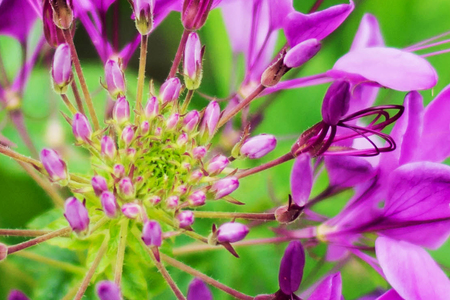 Flower Series : Close-up of a pink Cleome spinosa flower. Cleome hassleriana flowers or Spinnenblume with blurred background. Detail of pink flower in a garden.