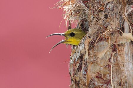 Sunbird and baby bird in a nest at Thailand. Olive-backed sunbird, Yellow-bellied sunbird, Cinnyris jugularis, Nectariniidae,
