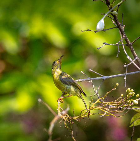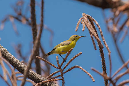 Bird (Olive-backed sunbird, Yellow-bellied sunbird) female yellow color perched on a tree in a nature wild