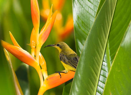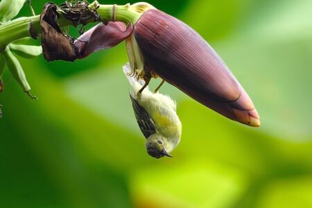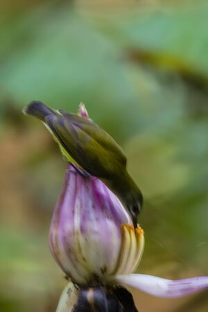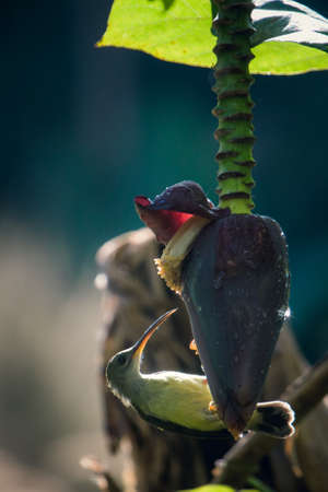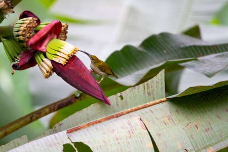 Tropical bird on banana flower. Olive-back sunbird on exotic flower. Jungle nature photo for wallpaper or background. Small yellow bird with blue chest. Nectar drinking bird. Tropical garden scene