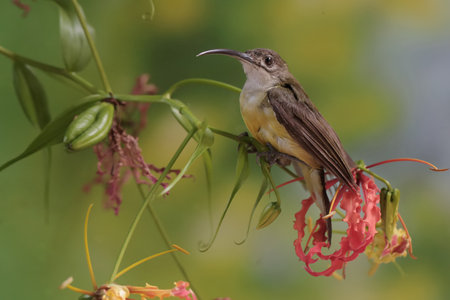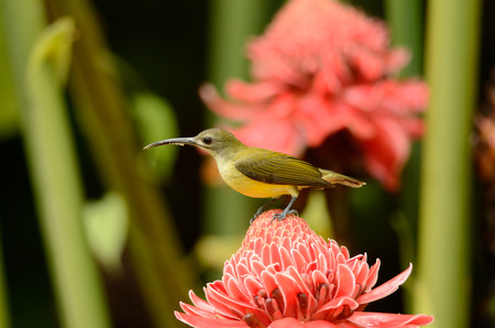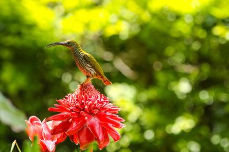 beautiful little spiderhunter Arachnothera longirostra possing on flawer