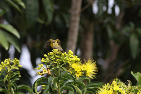 Yellow-breasted birds are feeding on the nectar of flowers.