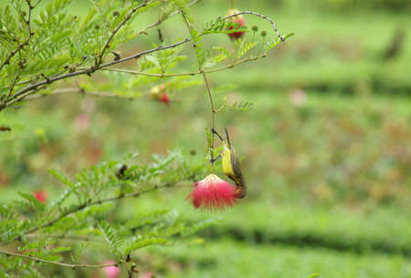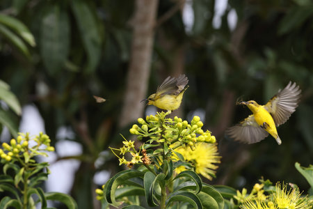 Olivebacked sunbird Yellowbellied sunbird on tropicalforestthailand.