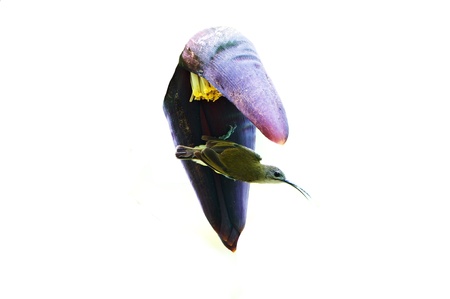 Little Spiderhunter perching on banana male flower bud looking into a distance