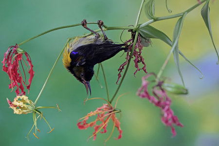 Olive-backed sunbird, Cinnyris jugularis, single bird on flower