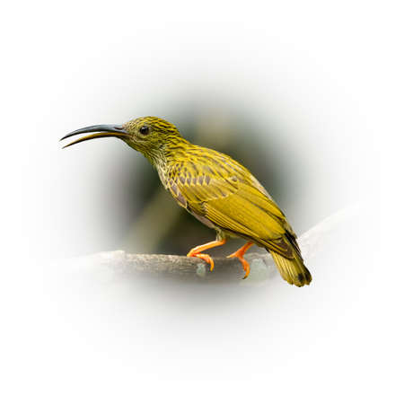 Streaked Spiderhunter perching on a perch looking into a distance isolated on round gradient blur background
