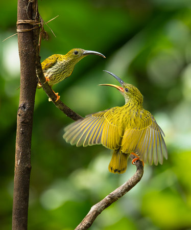 Two Streaked Spiderhunters (Arachnothera magna) engage in an animated interaction on intertwined forest branches. One bird spreads its wings and opens its beak mid-call, while the other perches calmly, observing the display. Their vibrant yellow plumage and bold streaks stand out beautifully against the lush green rainforest background. This image captures a striking moment of avian communication and natural behavior, ideal for themes related to wildlife, biodiversity, and tropical ecosystems.