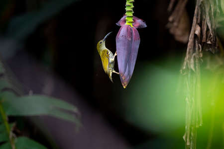 treaked Spiderhunter (Arachnothera magna) on Wild Banana Blossom in forest
