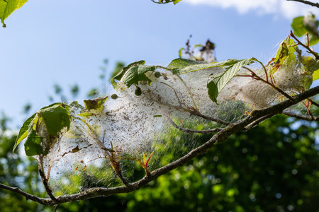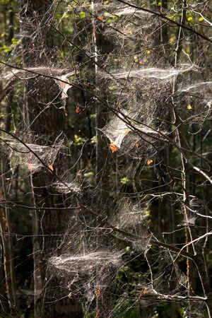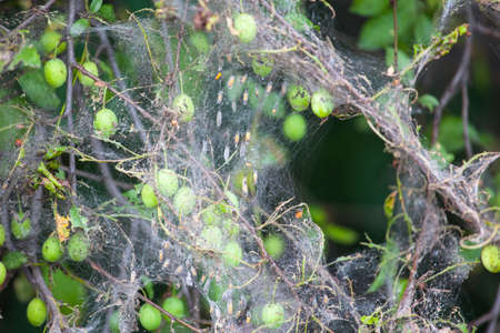 Nesting web of ermine moth caterpillars, yponomeutidae, hanging from the branches of a tree