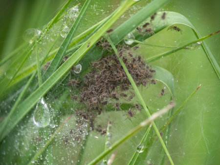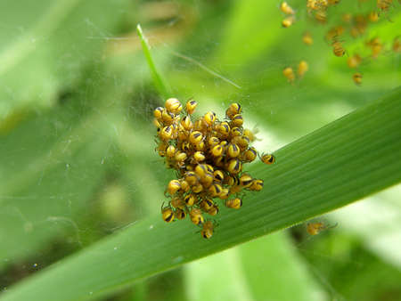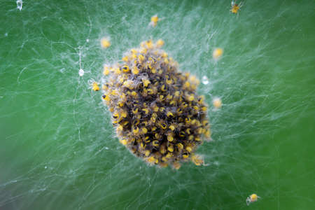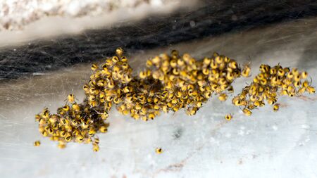 Young spiders, hatched from eggs in the nest. Colony of newborn spiders.