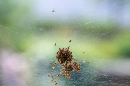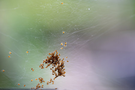 spiders of the species araneus diadematus in their web scattered. lots of black and yellow babies. Macro photography. Horizontal and copy space. detail. selective focus