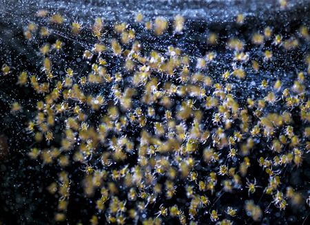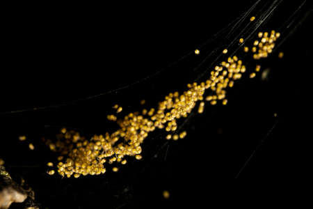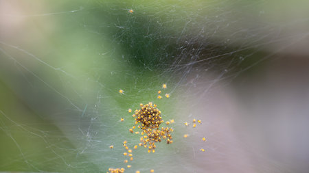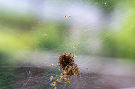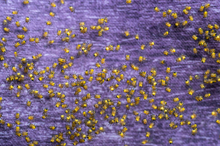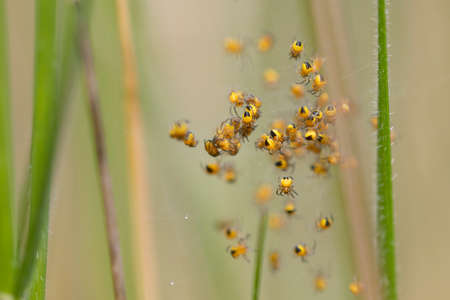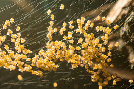 Macro shot of Tiny yellow spiderlings of European garden spider, diadem spider, orangie, cross spider or crowned orb weaver (Araneus diadematus) beginning to disperse in an orb web