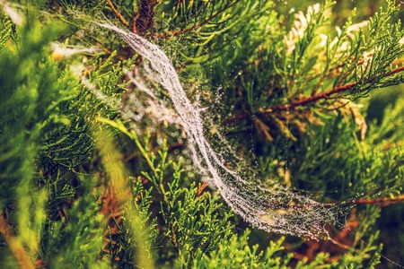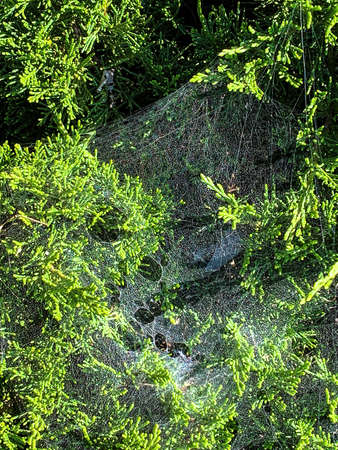 The web between the green branches of the western thuja, also known as the northern white cedar. Garden spiders weave their webs on trees and shrubs. A pest for garden plants. garden maintenance.