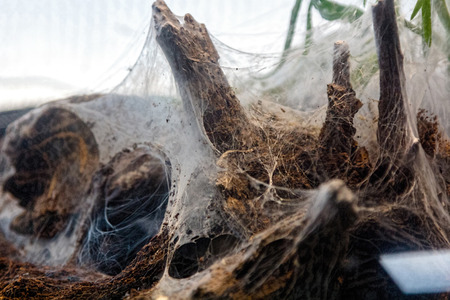 White web on a black brown background, scary frames made of cobwebs. High quality stock photo image featuring a real creepy spider web isolated against a creepy Halloween background
