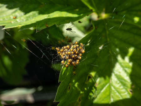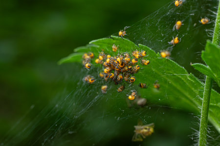 Macro shot of Tiny yellow spiderlings of European garden spider, diadem spider, orangie, cross spider or crowned orb weaver (Araneus diadematus) beginning to disperse in an orb web on a green leaf