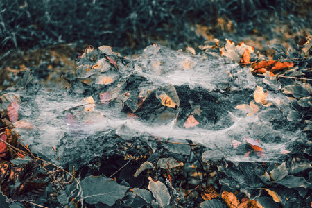 A delicate spider web is gracefully hanging over a large, colorful pile of fallen leaves, creating a beautiful natural scene