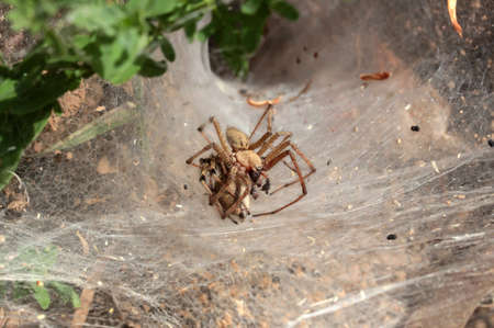 Cose up of hunting spider trying capturing a small insect in its web. Creative. Details of wild nature, a spider on blue sky background.
