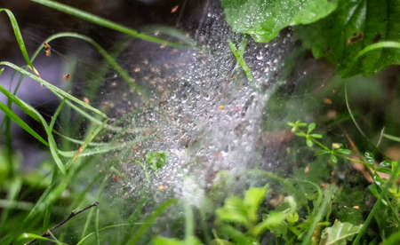 Close up abstract art macro photography of cobweb or spiderweb with rain or dew water drops in the morning fog. Natural abstract background.