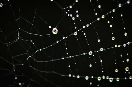 a macro of a beautiful spiders net in front of a black background with sparkling raindrops