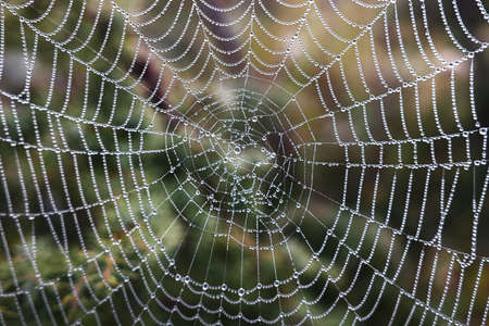 Morning dew. Shining water drops on spiderweb over green forest background.