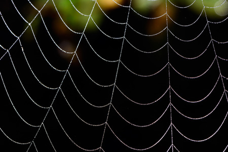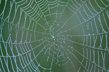 Spider web with dew droplets in big close up. Cobweb macro photographed at morning.