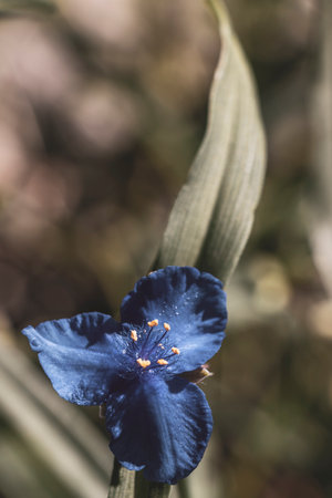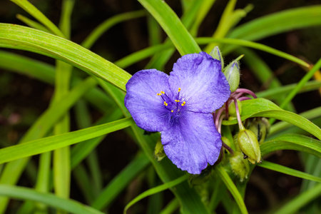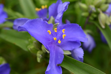 Close up of one blue Tradescantia virginiana, the Virginia spiderwort or Bluejacket flower in a sunny summer day in Scotland, United Kingdom