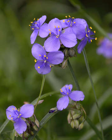 Blooming Purple Spiderwort flowers of the American Midwest Prairie photographed on a soft green background.