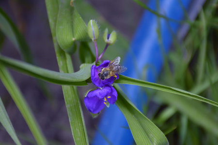 Beautiful blue flowers tradescantia garden closeup. Purple Tradescantia flower in garden, absorb dust and purify air.