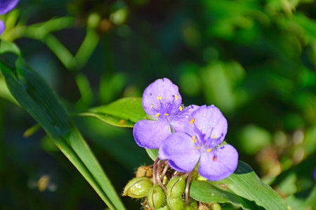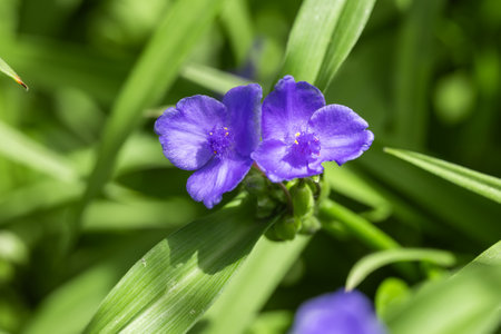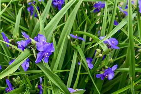 Close up of small blue flowers and green leaves of Tradescantia Virginiana plant, commonly known as Virginia spiderwort or Bluejacket in a sunny summer garden, beautiful outdoor floral background