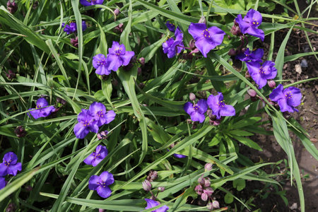 Beautiful purple flowers Tradescantia (Latin: Tradescantia occidentalis) in garden, closeup. Plant that absorbs dust and purify air. Precise selective focus.