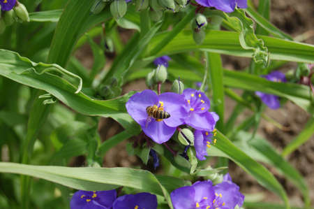 Pollination of flowers by insects. Bumblebee (Latin: Bombus) on purple flowers Tradescantia (Latin: Tradescantia occidentalis). A blooming summer garden. Selective focus. Soft blurry background.