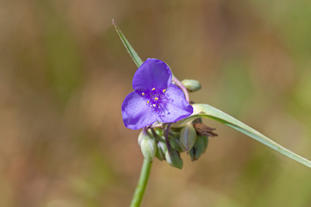 An Ohio Spiderwort sprouts from the prairie floor showing its purple flower head.