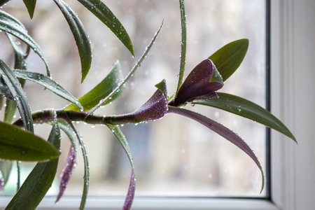 Tradescantia spathacea or a plant called boat lily in water drops on a window