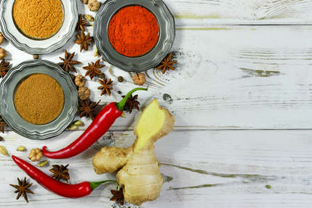 Colorful variety of Indian spices with fresh chili and ginger on white wooden table top