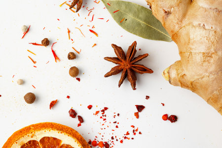 Ginger wedges. Cinnamon sticks, cardamom and cloves on white background. Flat lay. Copy space