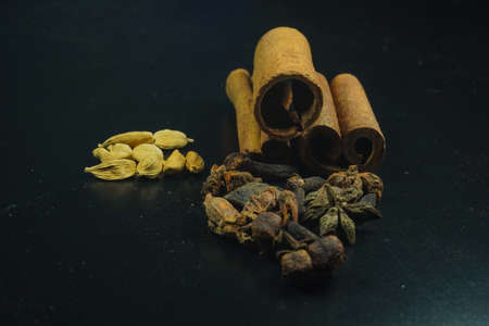 various aromatic spices and herbs on black background. star anise, cloves, cardamom, cinnamon stick