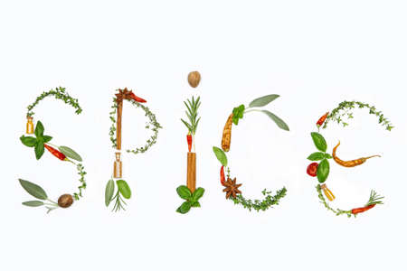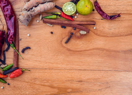 Healthy food herbs Spices for use as cooking ingredients on a wooden background with Fresh organic vegetables on wood. The concept of food ingredients with Variety on the rustic table.