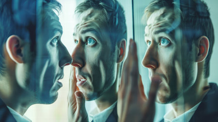 Reflective encounter in broken glass showcasing a thoughtful expression under natural light