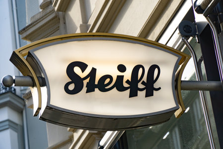 Wiesbaden, Germany - June 03 2018: STEIFF logo on a facade. Founded in 1880, Steiff is the world? ? ? s premier manufacturer of high-end toys and collectibles.