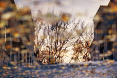 Reflection of trees in a puddle at sunset in Paris, France