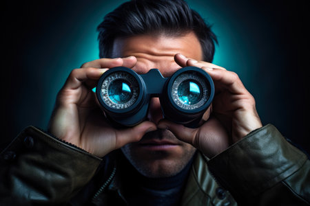 Close-up of unrecognizable person holding binoculars with reflections, exploring city surroundings
