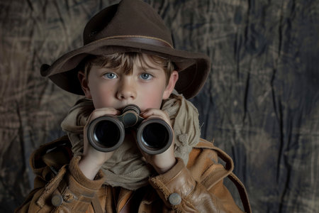 Portrait of man in hat holding binoculars on orange background : Generative AI