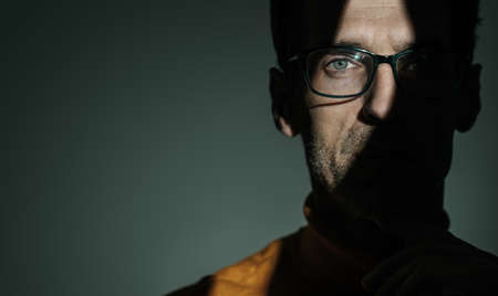 Undercover CIA agent or cool mystery man with glasses. Private detective in disguise hiding face under cap and sunglasses. Cinematic mysterious concept. Police investigator spy. Serious model portrait