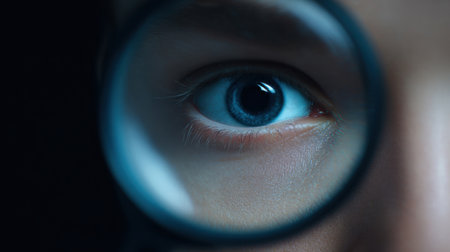 A close up of a person's eye with a magnifying glass. The eye is blue and the person's face is dark