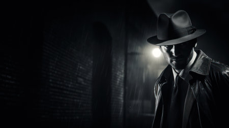 Photo of a shaded detective in jacket and hat holding a revolver gun on black background.