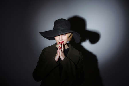 attractive blonde with a retro hairstyle in a black hat with a wide brim